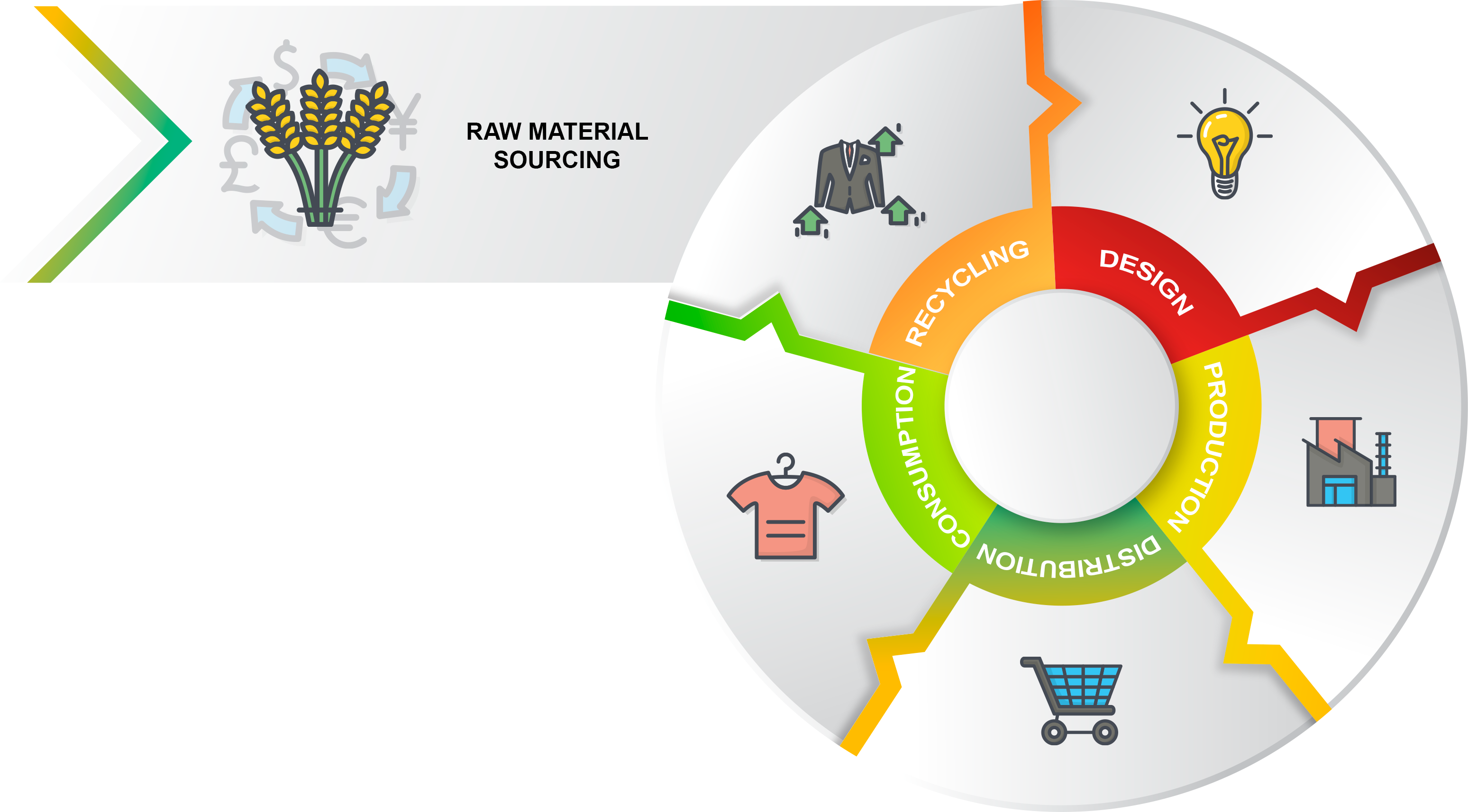 Another way to stop this endless cycle of fast fashion waste is to embrace a circular economy. The circular fashion value chains aim to reduce the environmental impact that the industry has, including using recycled waste to produce fabrics, initiating clothing take-back programs, and other textile recycling innovations. Circular fashion is a term introduced by Dr. Anna Brismar, the head of the Swedish consultancy firm Green Strategy. The term is defined as clothing, shoes, and accessories designed, sourced, and produced to be used and circulated effectively and responsibly in our society in their most valuable form for as long a time as possible. They are then returned safely to the biosphere. The circular fashion value chain begins with raw material sourcing that then leads to design, production, distribution, consumption, and then finally, recycling.