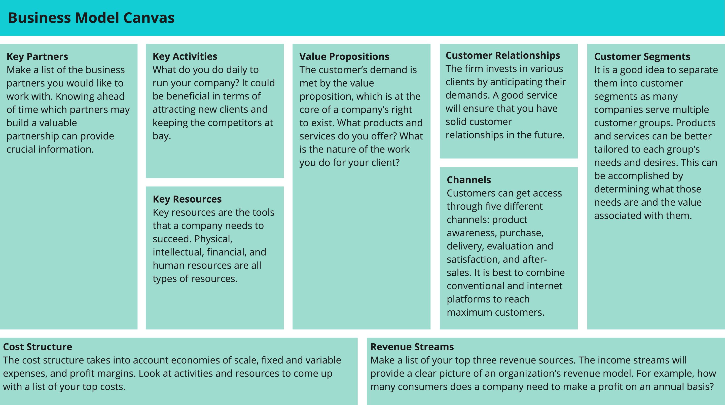 Business Model Canvas is a graphical depiction of several factors that depict organizational values. The BMC can help you communicate with your team and clients about how things are going in your company and why they do business with you. Your business can be easily planned by breaking it down into different segments using a business model canvas.