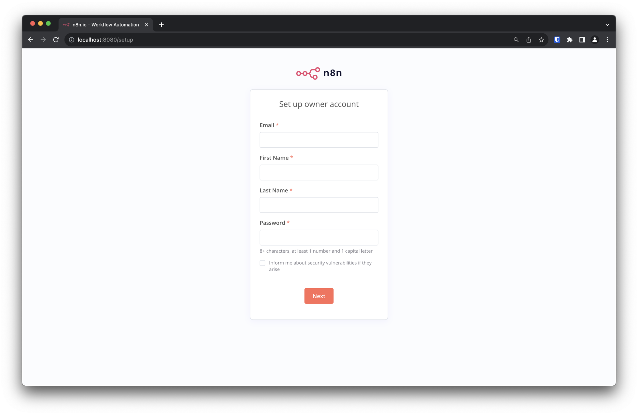 user@localhost ~ % docker run --rm --name n8n-test -p 8080:5678 n8nio/n8n:1.1.1